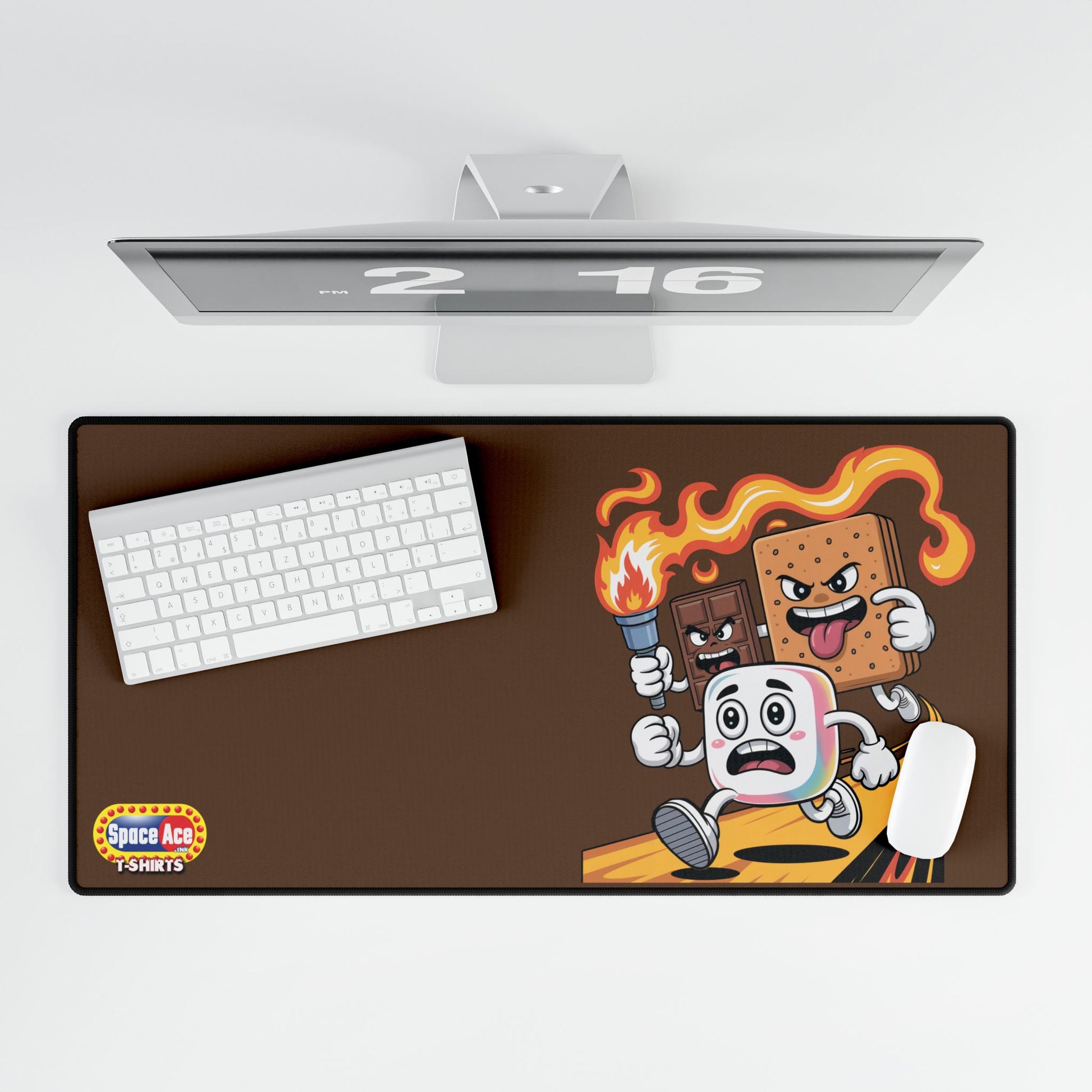 A playful, oversized desk mat that brings cartoon energy to your workspace. Bright, crisp printing showcases animated s’mores characters— a toasted marshmallow, chocolate bar, and graham cracker—racing with a torch across a warm brown background. The smooth polyester surface lets your mouse glide silently while the natural rubber base grips the desk so the mat stays put during long gaming sessions or focused work. Anti-fray stitched edges and durable materials hold up to daily use, and three size options mean you can anchor a single monitor setup or cover a full keyboard and mouse area. This mat adds a pop of personality to late-night streams, snack-fueled design sessions, or casual desk setups where comfort and fun matter.