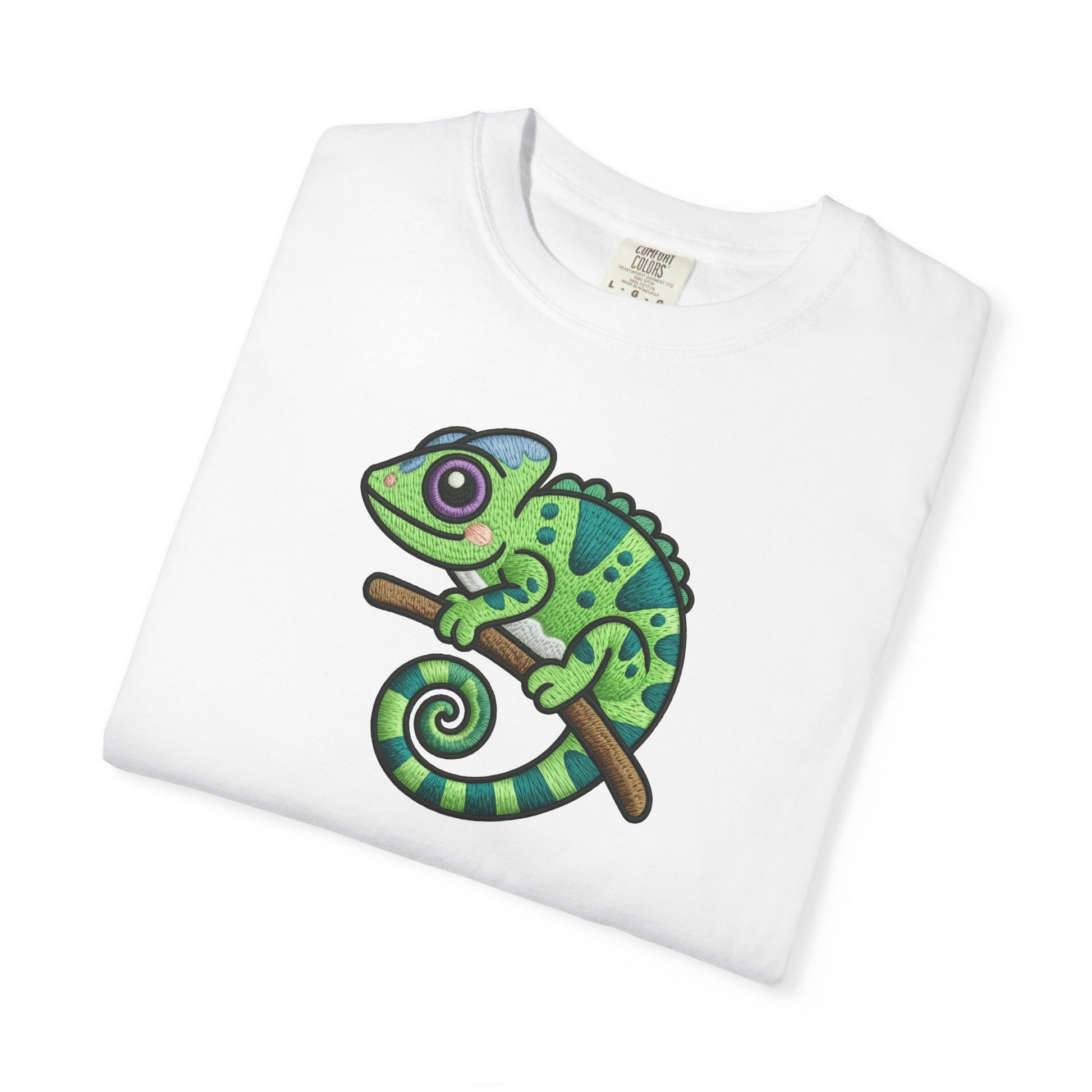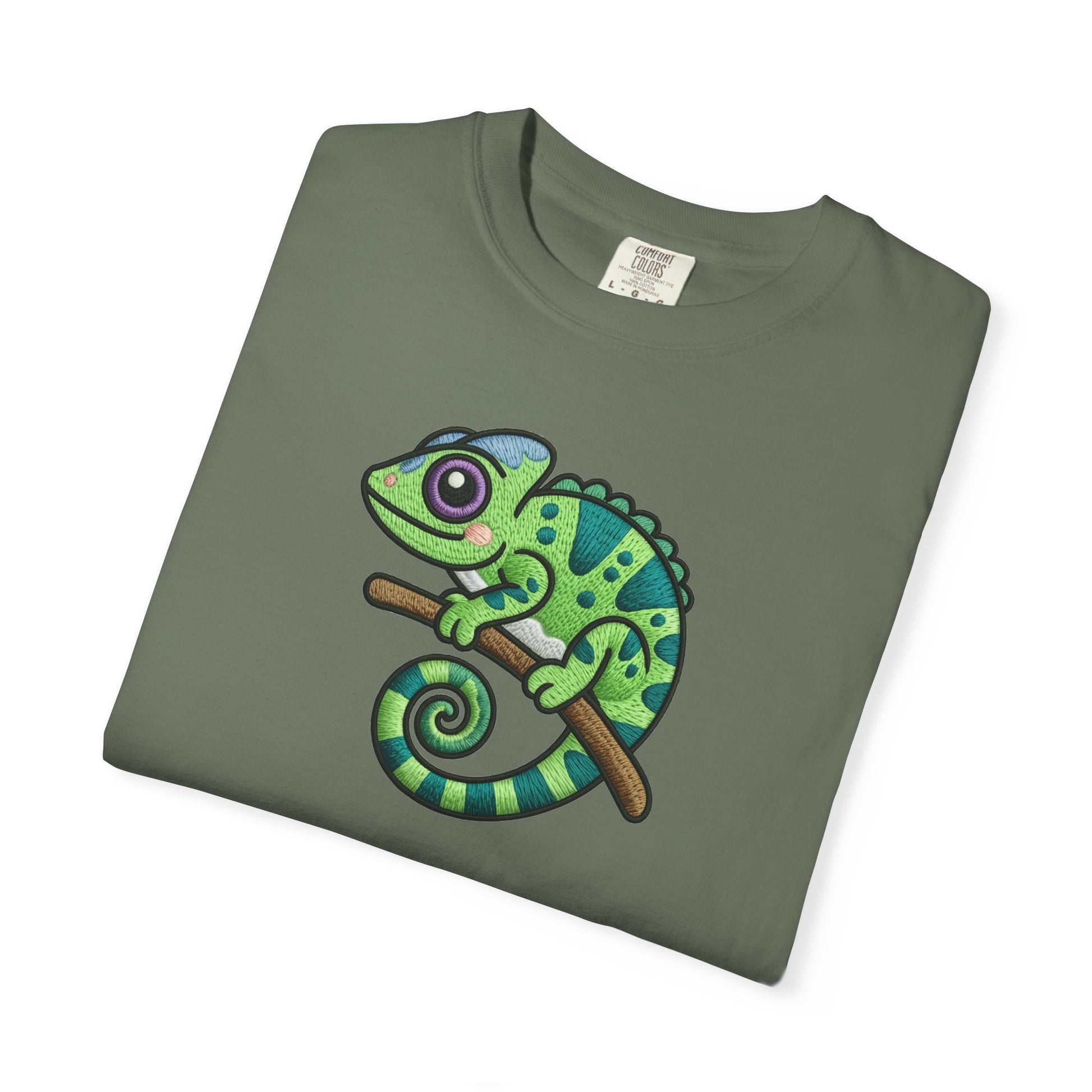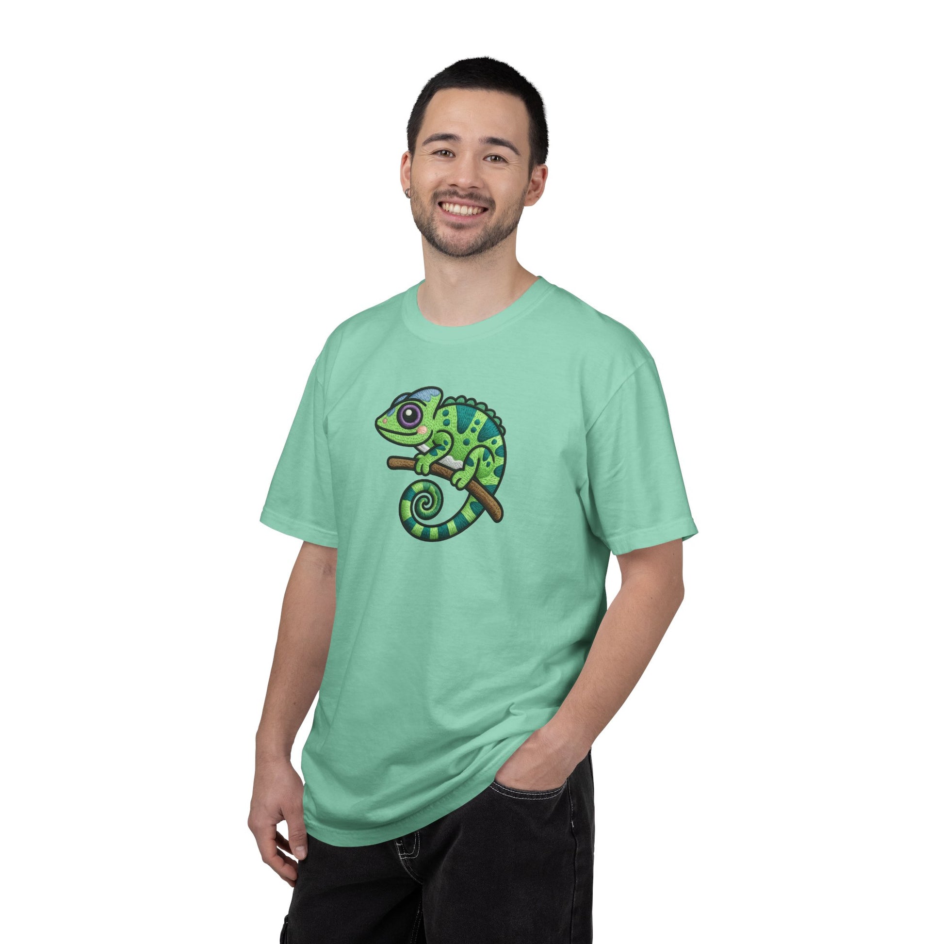 Soft, worn-in comfort meets playful nature. This heavyweight cotton tee carries a hand-drawn chameleon perched on a branch — bright greens and subtle textures that pop against garment-dyed colorways. It feels lived-in from day one: the fabric is soft, slightly faded from the dyeing process, and roomy enough to move in. Wear it on slow mornings with coffee, at nature walks where you scan the trees for hidden things, or layered under a flannel for cool evenings. The chameleon design looks like it is embroidered, but it is just an illusion.